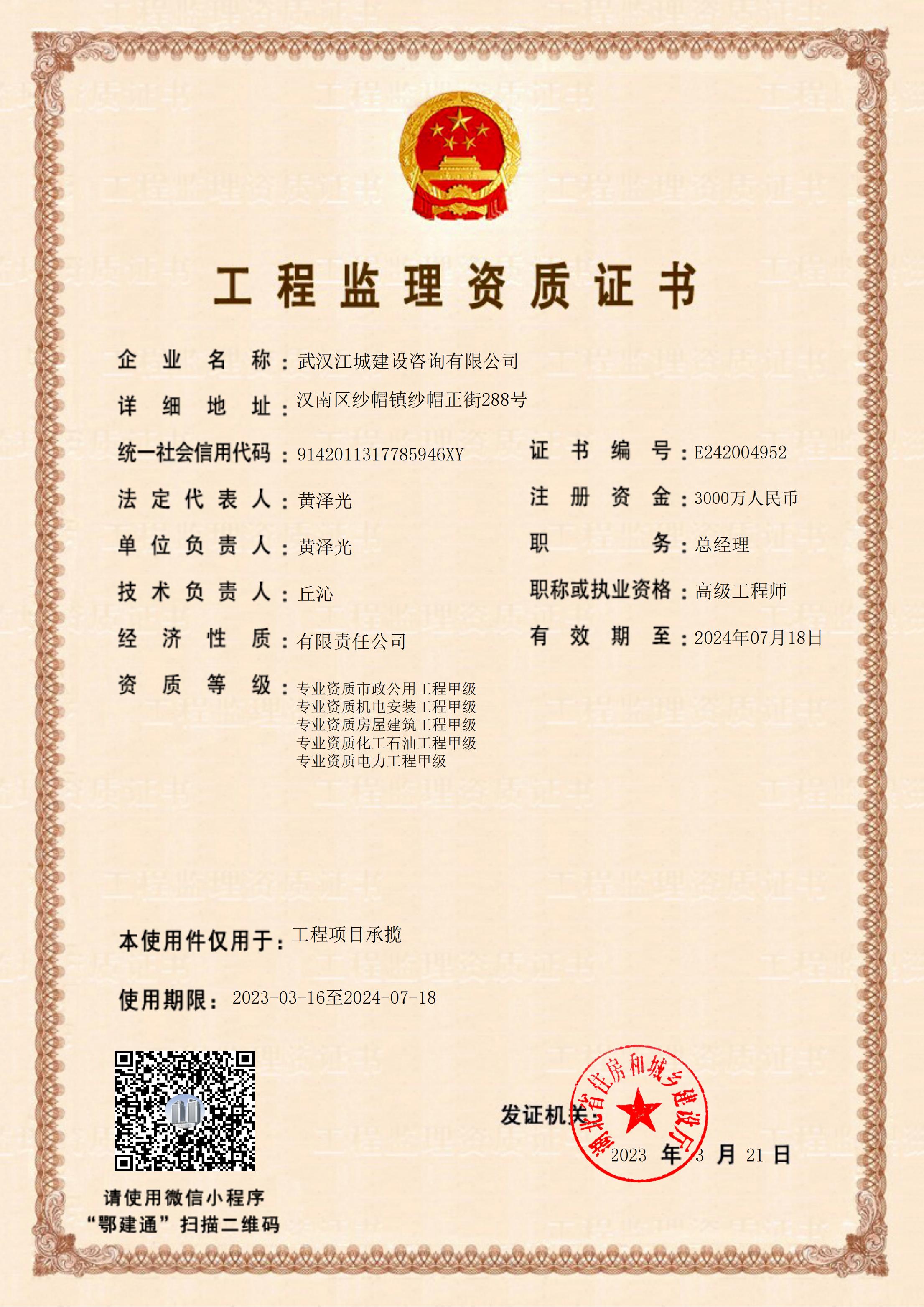 2023年3月17日,湖北省住房和城鄉(xiāng)建設(shè)廳公布了核準(zhǔn)的工程監(jiān)理企業(yè)資質(zhì)——武漢江城建設(shè)咨詢有限公司(以下簡稱“武漢江城”)獲電力、化工石油專業(yè)甲級資質(zhì),形成了具備房建、市政、機(jī)電、電力、化工石油五項(xiàng)甲級資質(zhì)的“新江城”?!靶陆恰睂⒁怎謪枈^發(fā)、篤行不怠的姿態(tài)勇毅前行,力行盡快申請到綜合級監(jiān)理資質(zhì),屆時(shí)武漢江城將會以監(jiān)理為契機(jī),重組相關(guān)設(shè)計(jì)資質(zhì),努力為開拓發(fā)展全過程工程咨詢服務(wù)創(chuàng)造條件。